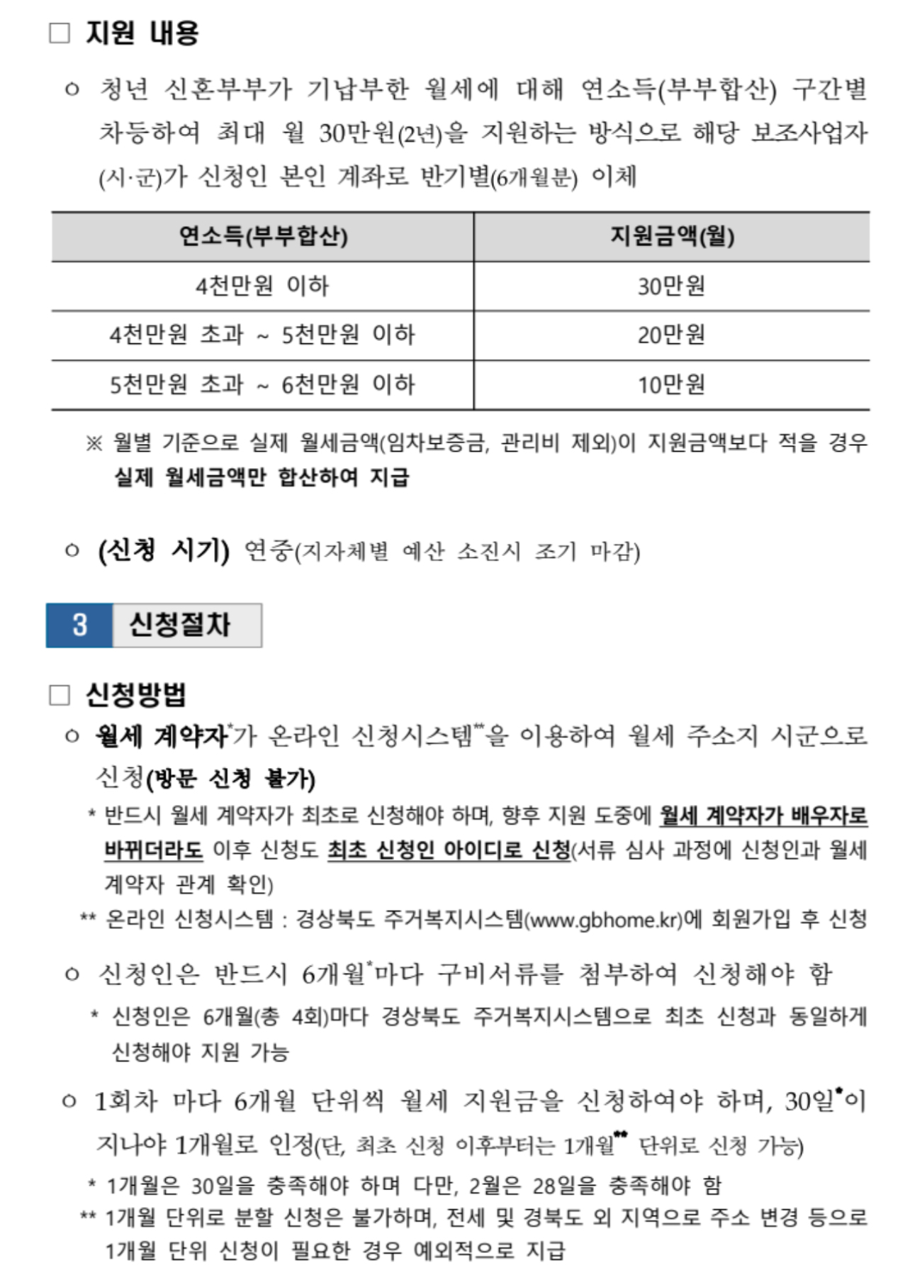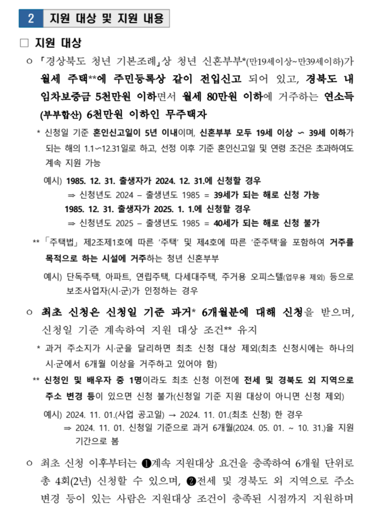 * 자세한 사항은 붙임파일 「2024년도 청년 신혼부부 월세 지원사업」 공고문(https://www.gumi.go.kr/doryang/board/post/view.do?bcIdx=1&mid=0201000000&idx=811568)을 참고하시기 바랍니다.