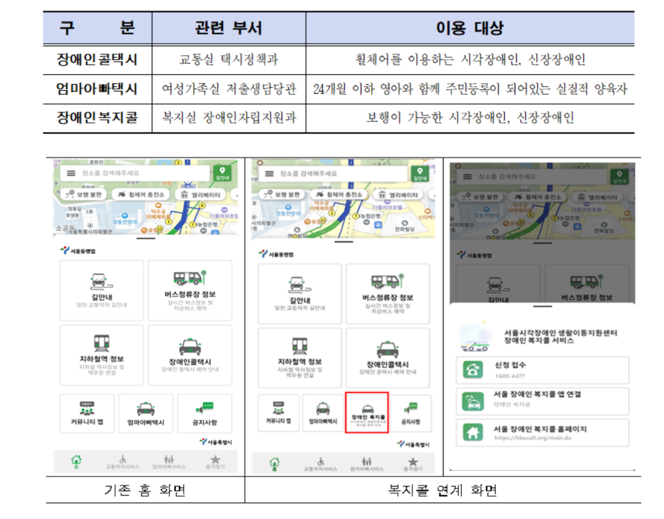 장애인복지콜, 엄마아빠택시 등 교통수단 예약도 가능, 시각·색약자 배려 디자인 구성