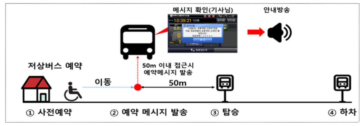 이용자가 앱에서 버스 정보 검색 후 노선과 승·하차 정류소를 예약하면 해당 버스가 이용자 대기 정류소 50m범위 내 도착 시 예약정보가 버스기사에게 전달되는 방식입니다.