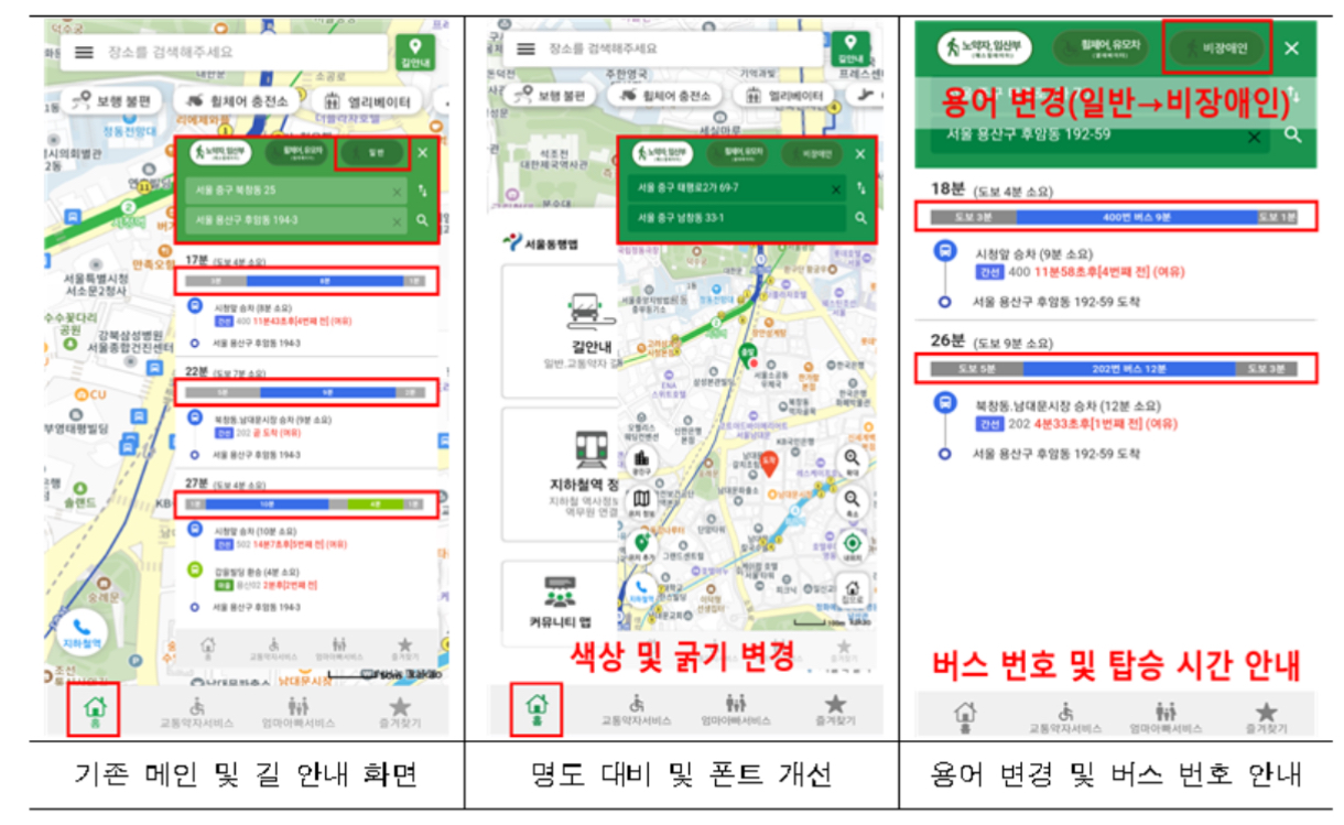 시각약자, 색약자도 이용하기 편하도록 글씨 크기와 굵기, 색상 등을 변경해 시인성을 높였고 화면낭독기(스크린리더) 기능도 추가해 지도·경로 검색 시 편의성을 높였습니다.