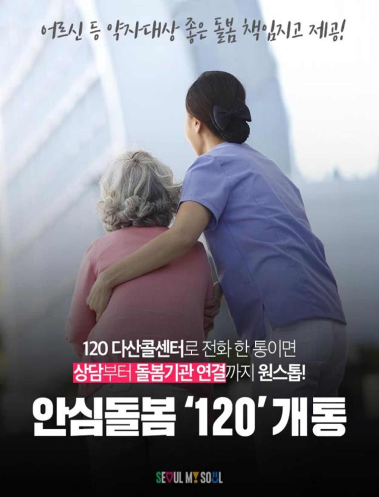 하지만 앞으로는 돌봄이 필요한 어르신·장애인 등 당사자는 물론 가족, 지인 누구든지 다산콜센터(☎02-120)로 전화 후 음성안내에 따라 3번(안심돌봄)을 누르면 돌봄전문콜센터 「안심돌봄120」의 밀착 상담을 받을 수 있다고 합니다.