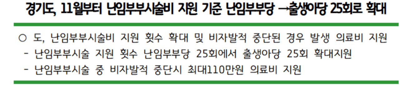 경기도가 2024년 11월 1일부터 난임부부시술비를 기존 난임부부당 25회에서 출생아당 25회로 확대 지원한다고 합니다.