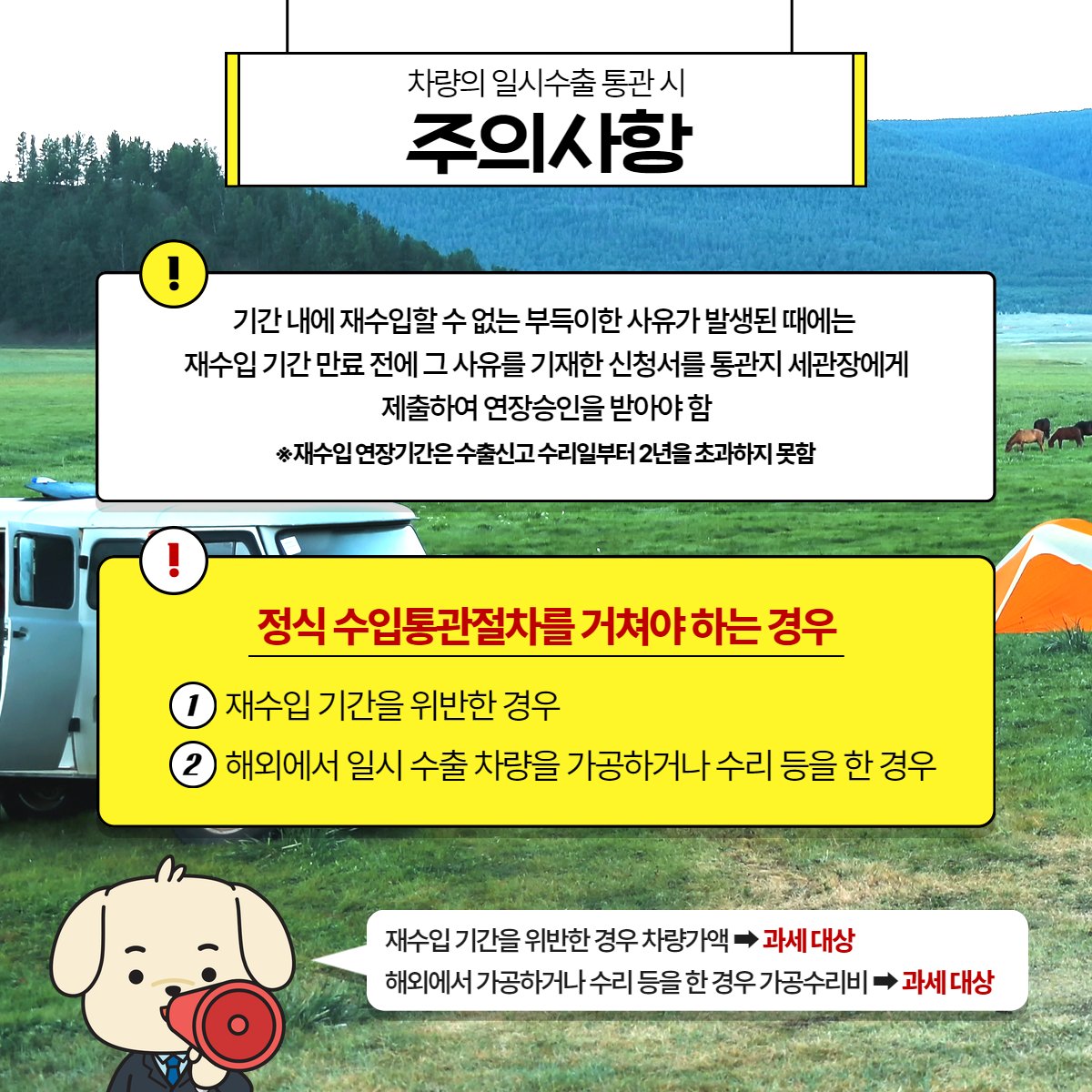 ※반대로 해외 차량을 국내 여행 목적으로 들여올 때는 차량 일시 수입 통관을 거쳐야 합니다.
