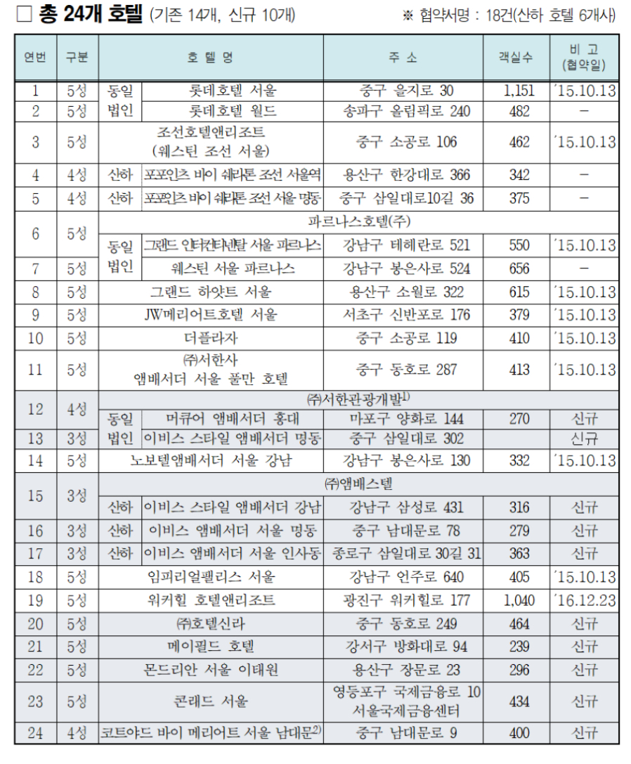 서울시는 이에 머물지 않고 10개 호텔이 추가된 24개 호텔과 새롭게 업무 협약을 맺었습니다.