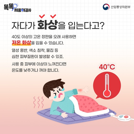 40도 이상의 고온 장판을 오래 사용하면 저온 화상을 입을 수 있습니다.