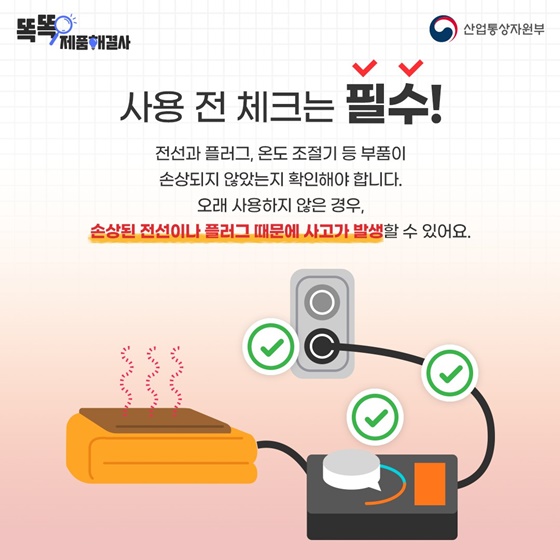 전선과 플러그, 온도 조절기 등 부품이 손상되지 않았는지 확인해야 합니다. 오래 사용하지 않은 경우 손상된 전선이나 플러그 때문에 사고가 발생할 수 있습니다.