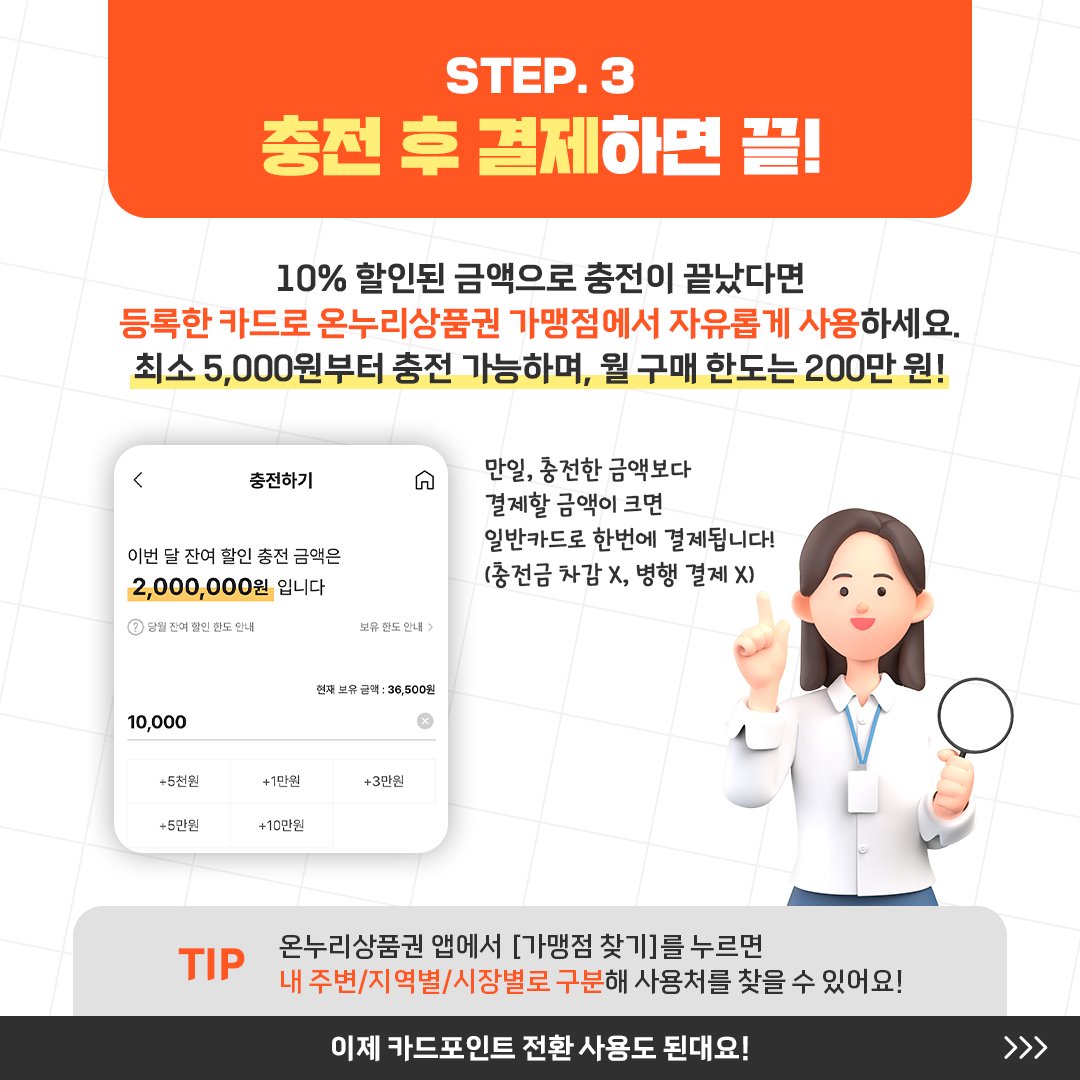 10% 할인된 금액으로 충전이 끝났다면 등록한 카드로 온누리상품권 가맹점에서 자유롭게 사용하세요.