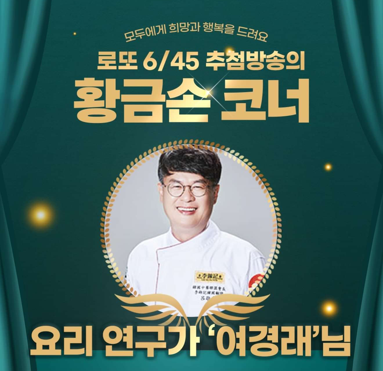 나눔으로 희망을 밝히는 요리 연구가 여경래가 1,145회 MBC 생방송 행복드림 로또 6/45‘황금손’으로 출연한다고 합니다.
