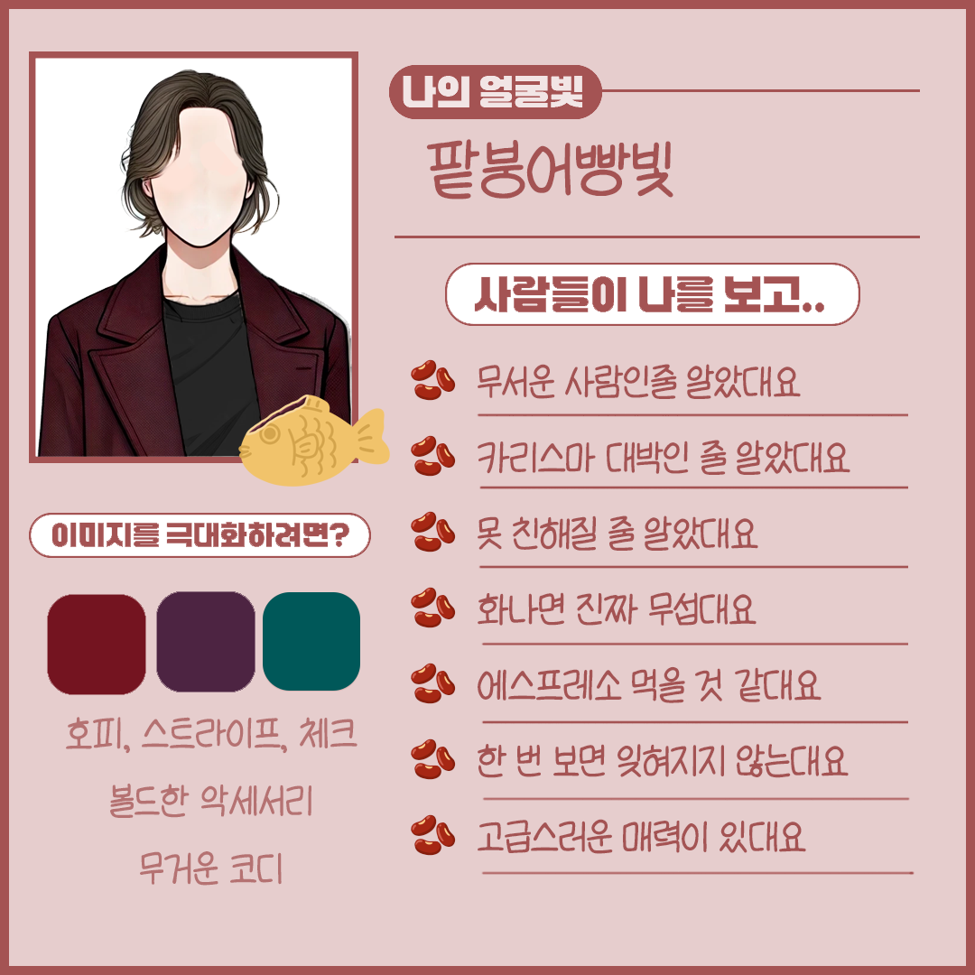 진하고 깊은 팥처럼 차분하고도 고급스러운 무게감을 지닌 당신의 낯빛은 팥붕어빵빛입니다.