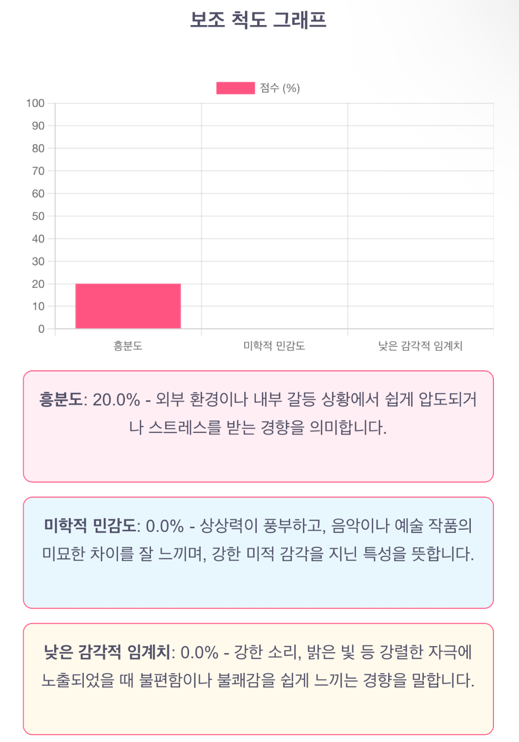 흥분도: 20.0% - 외부 환경이나 내부 갈등 상황에서 쉽게 압도되거나 스트레스를 받는 경향을 의미합니다.