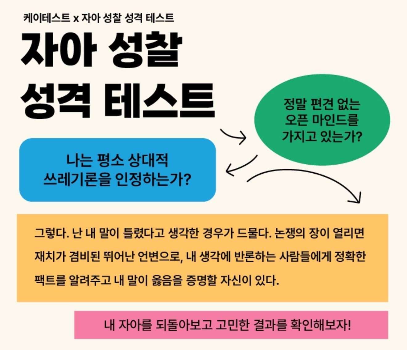 내 자아를 되돌아보고 결과를 확인해 보는 케이테스트에서 나온 ‘자아 성찰 성격 테스트’를 소개드리겠습니다.