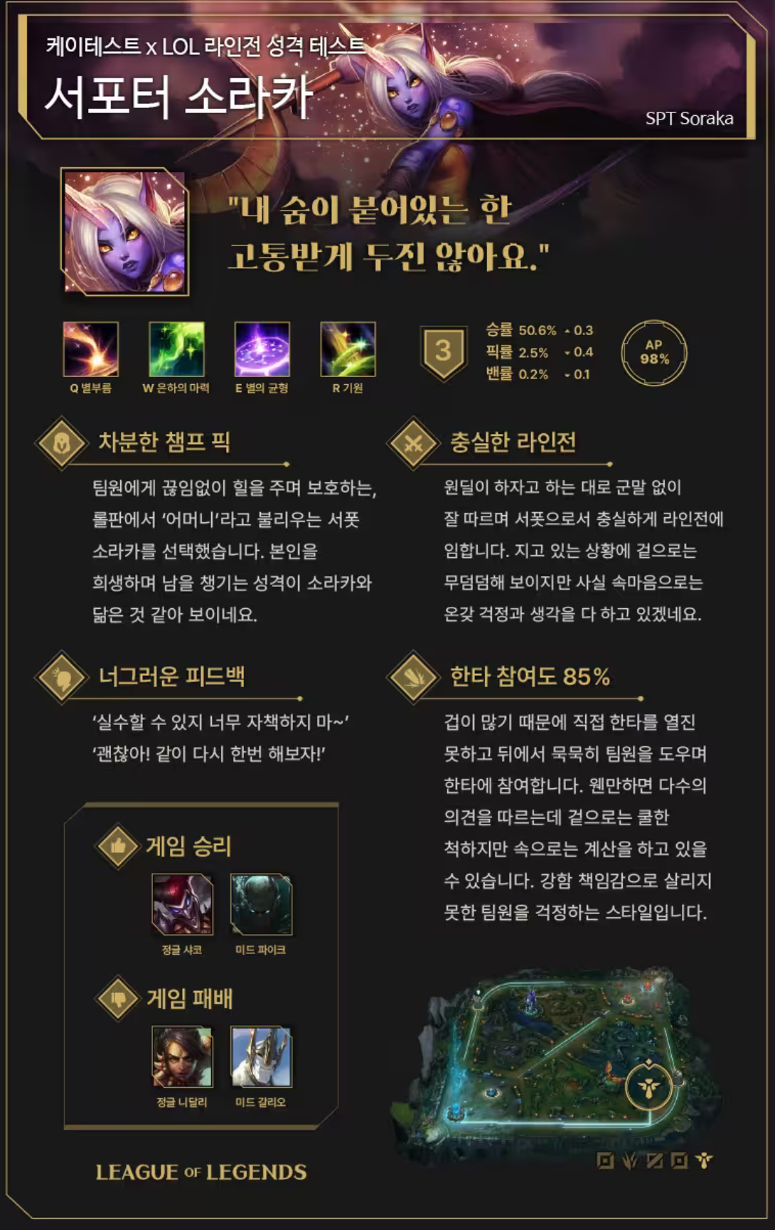 내게 어울리는 라인은 어디일지 알아보는 케이테스트에서 나온 ‘롤 라인전 성격 테스트’를 소개드리겠습니다.