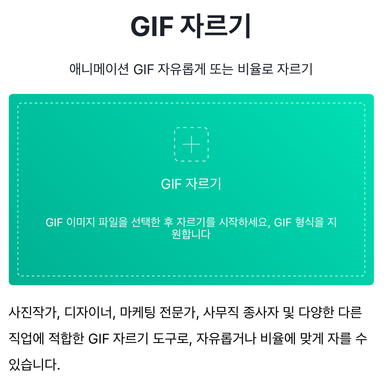 이를 통해서 사진작가, 디자이너, 마케팅 전문가, 사무직 종사자 및 다양한 다른 직업에 적합한 GIF 자르기 도구로, 자유롭거나 비율에 맞게 자를 수 있습니다.