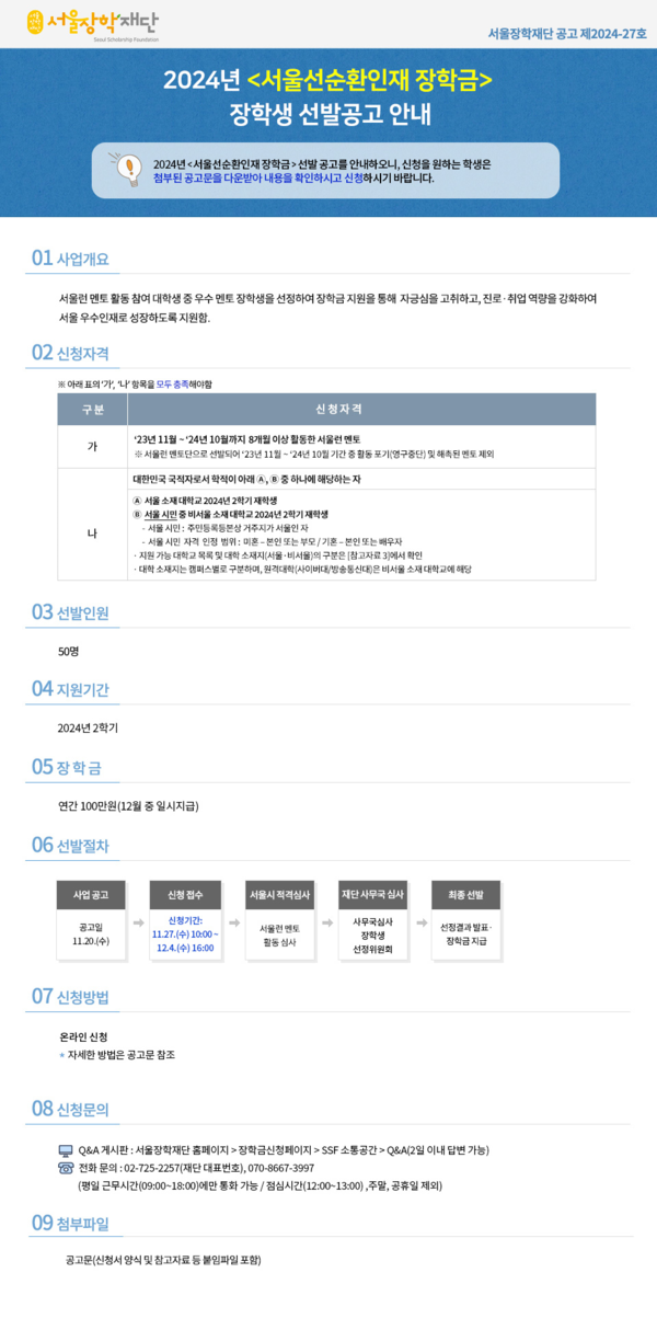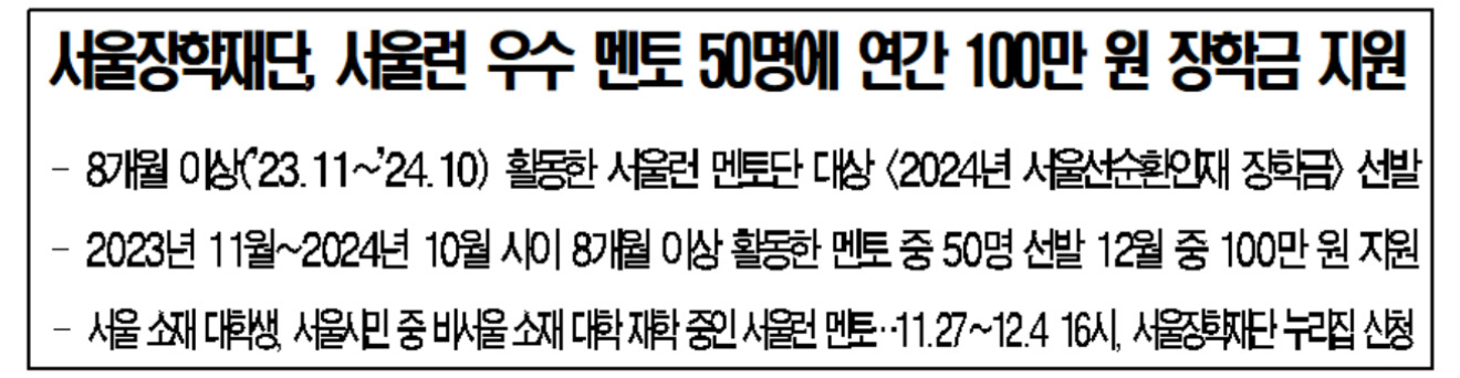 서울장학재단(이하 재단)이 서울런 멘토 참여 대학생들의 자긍심을 높이고, 진로와 취업 역량을 강화하여 서울을 대표하는 우수 인재로 성장하도록 지원하기 위해 <2024년 서울선순환인재 장학금> 장학생을 모집한다고 합니다.