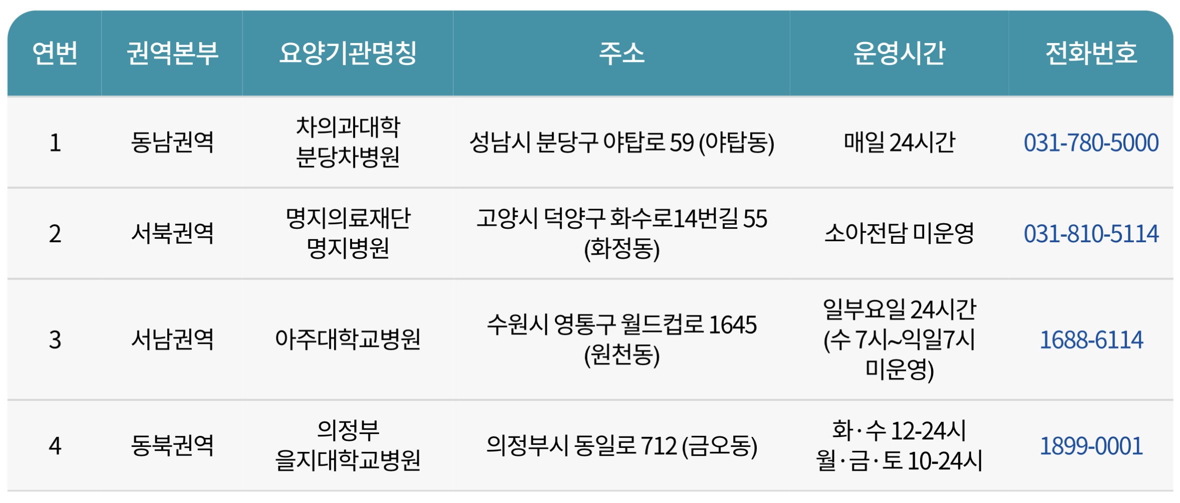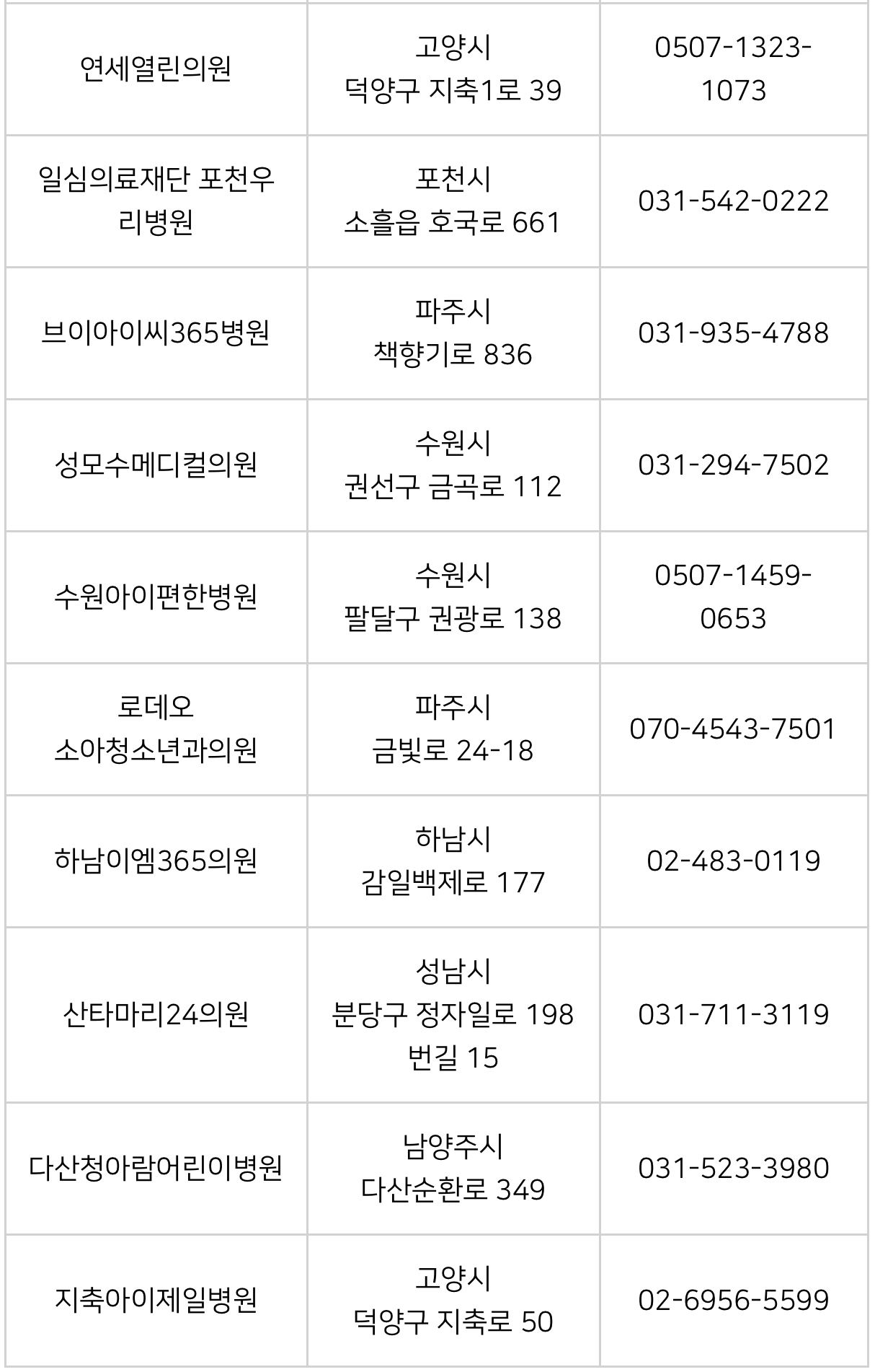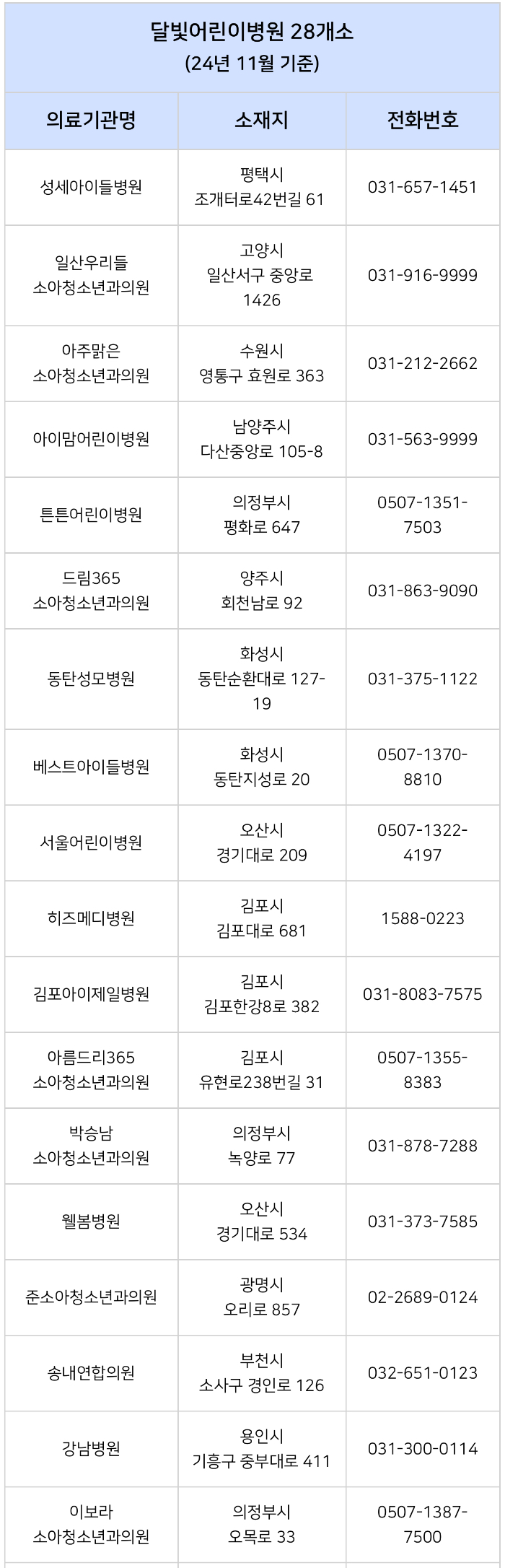 경기도 내 달빛어린이병원 28곳과 취약지 소아 야간·휴일 진료기관 12곳, 총 40곳의 목록은 아래에서 확인하실 수 있습니다.