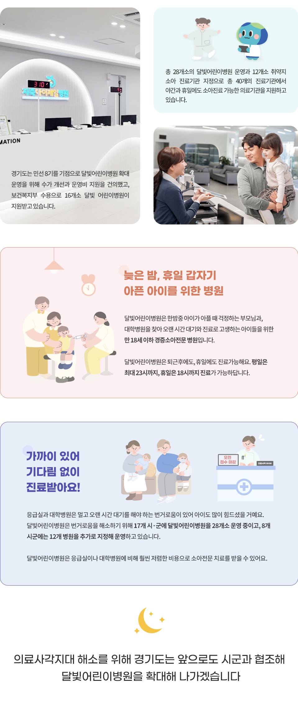 경기도 달빛어린이병원은 만 18세 이하 경증 소아환자를 대상으로 평일 23시, 주말 18시까지 외래진료를 제공하는 병원입니다.