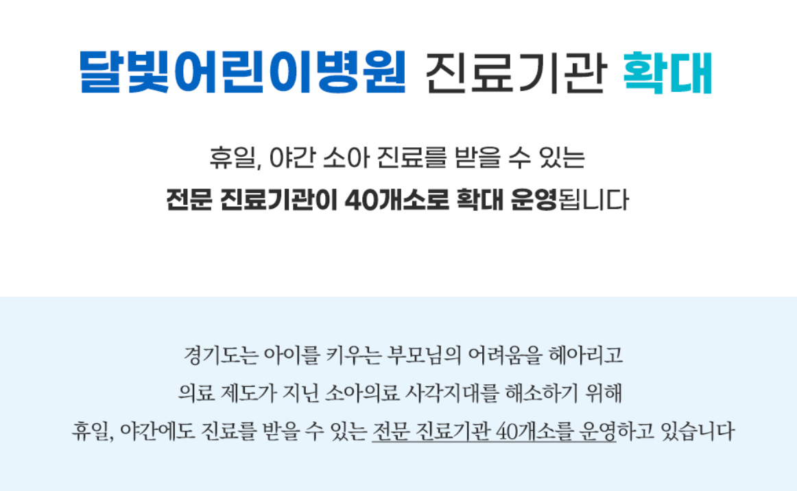 현재 경기도에서는 경기도 취약지 소아 야간·휴일 진료기관 12곳도 8개 시군에서 운영되고 있는데 인력채용 등의 문제로 달빛어린이병원의 운영시간을 충족하지는 못하지만 야간과 휴일에 진료를 받을 수 있는 기관입니다.