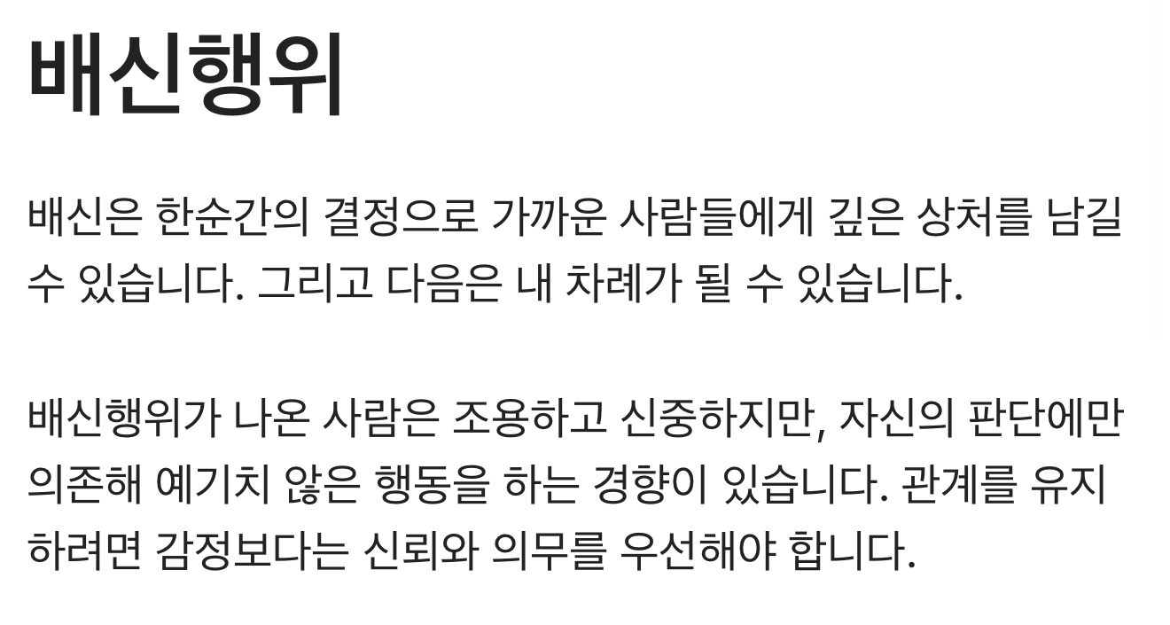 배신행위가 나온 사람은 조용하고 신중하지만, 자신의 판단에만 의존해 예기치 않은 행동을 하는 경향이 있습니다.