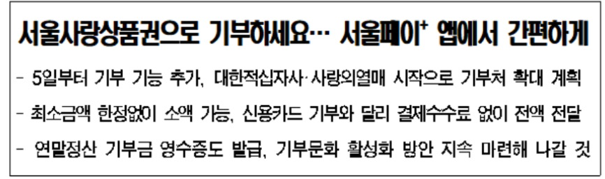 서울시가 서울사랑상품권 구매‧결제 애플리케이션 ‘서울페이플러스(+)’에 상품권 기부 기능을 추가한다고 합니다.