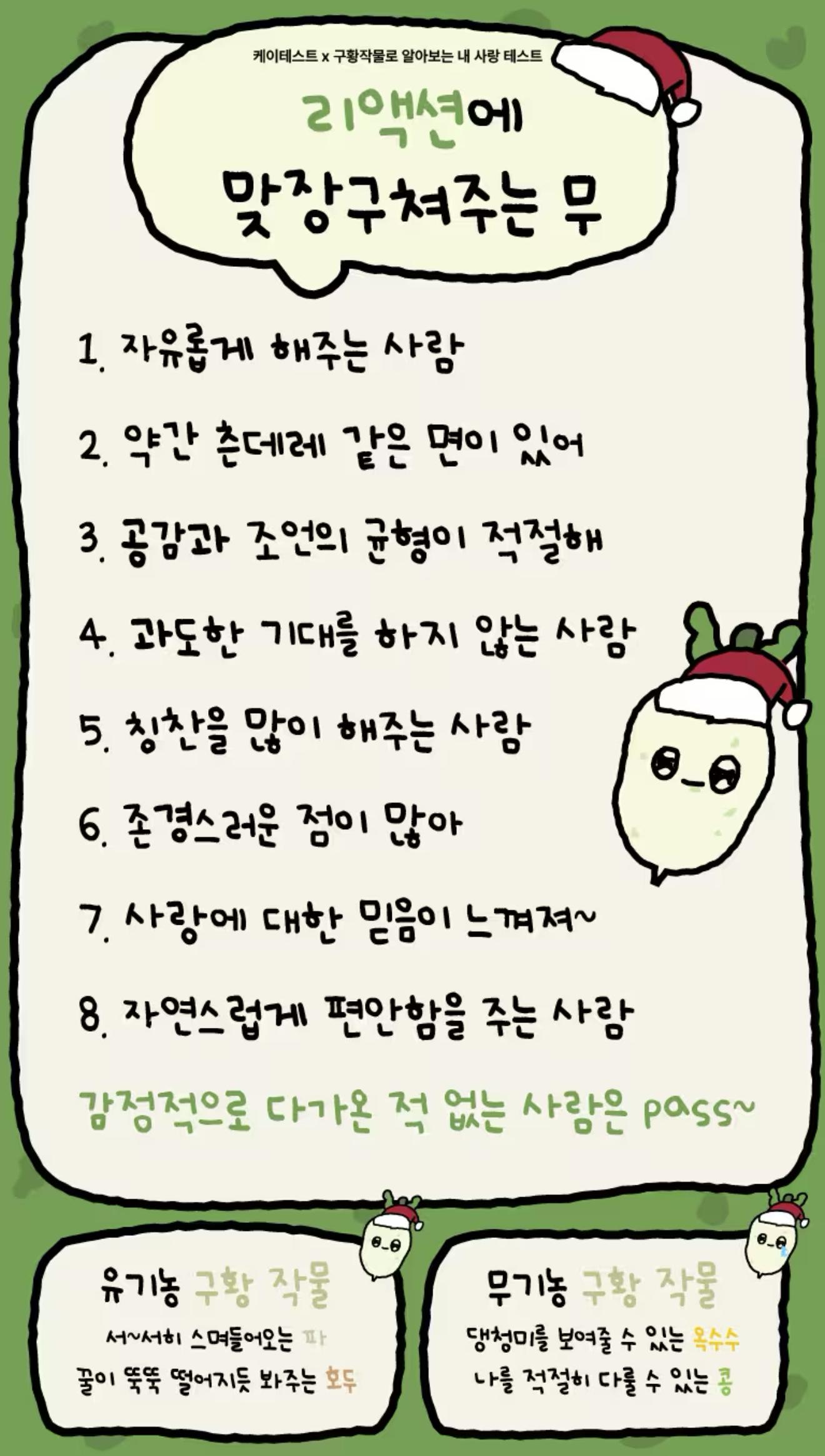 케이테스트에서 나온 ‘구황작물로 알아보는 내 사랑 테스트’를 소개드리겠습니다.