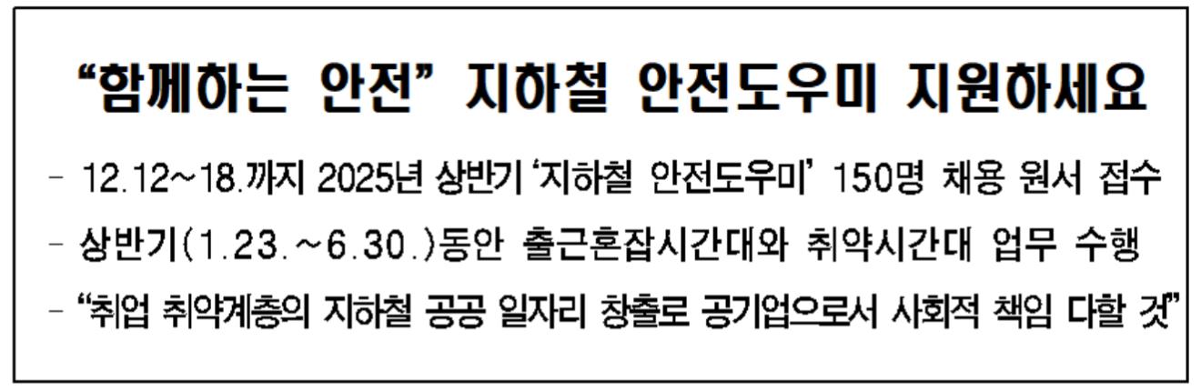 서울교통공사(사장 백호)는 지하철 이용 시민의 안전 확보 업무를 돕는 ‘지하철 안전도우미’를 모집한다고 밝혔습니다.