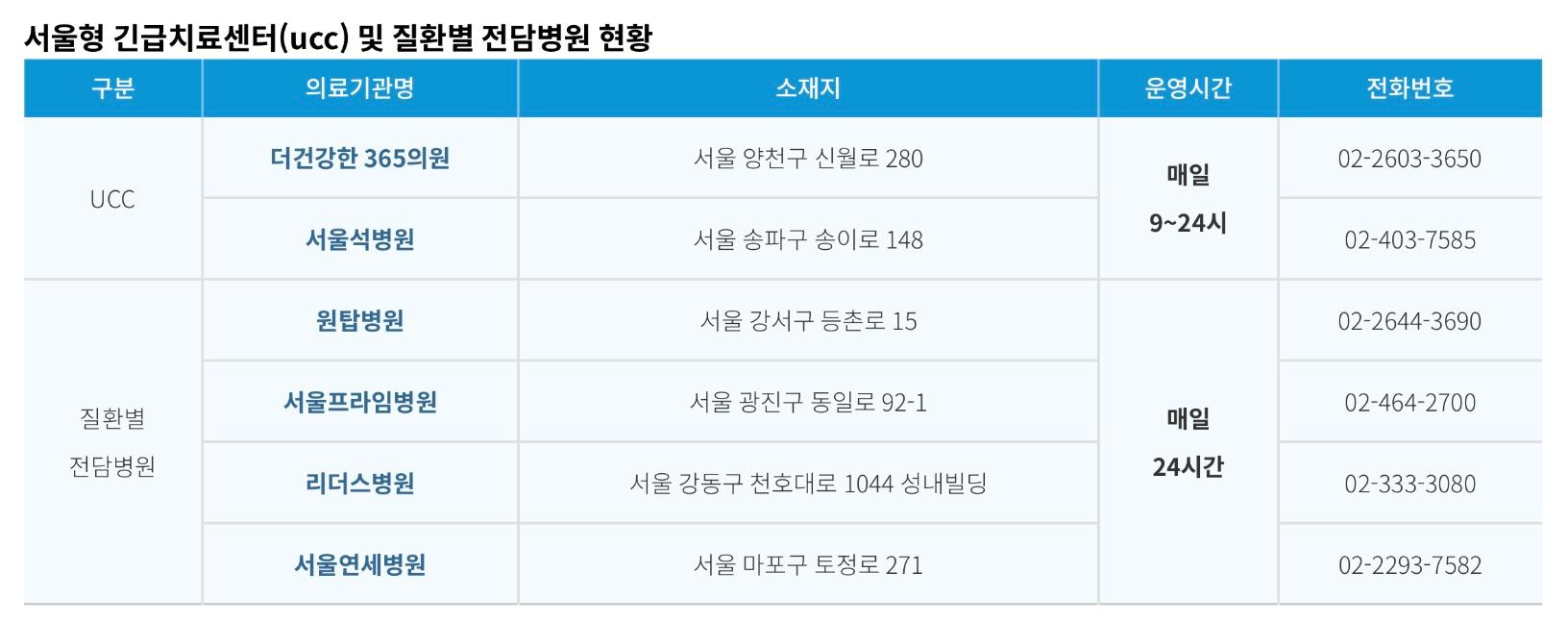 서울형 긴급치료센터(ucc) 및 질환별 전담병원 현황