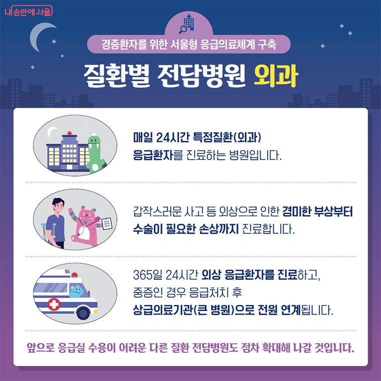 ‘서울형 질환별 전담병원’에는 365일 24시간 의사 1명 이상이 상주하며 외상 응급환자 진료 및 응급수술을 위한 시설과 장비를 갖추고, 내원 환자나 119구급대 이송환자도 진료하게 된다고 합니다.