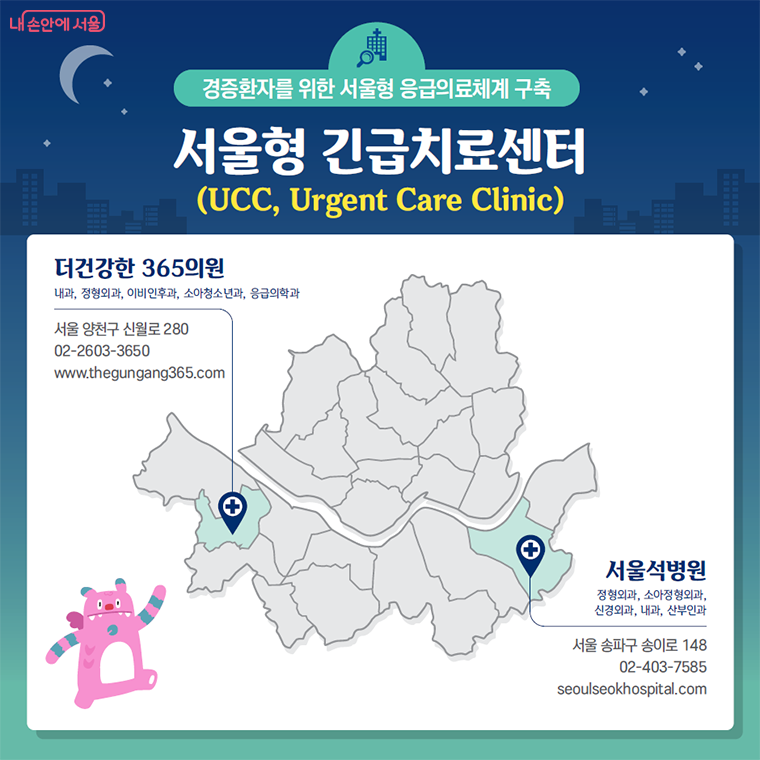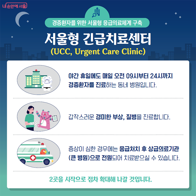 서울시가 전국 최초로 의료기관, 119구급대와 협력체계를 구축해 야간·휴일 경증환자가 응급진료를 받을 수 있는 ‘서울형 긴급치료센터(UCC, Urgent Care Clinic)’ 2곳과 ‘서울형 질환별 전담병원’ 4곳의 운영을 시작한다고 합니다.
