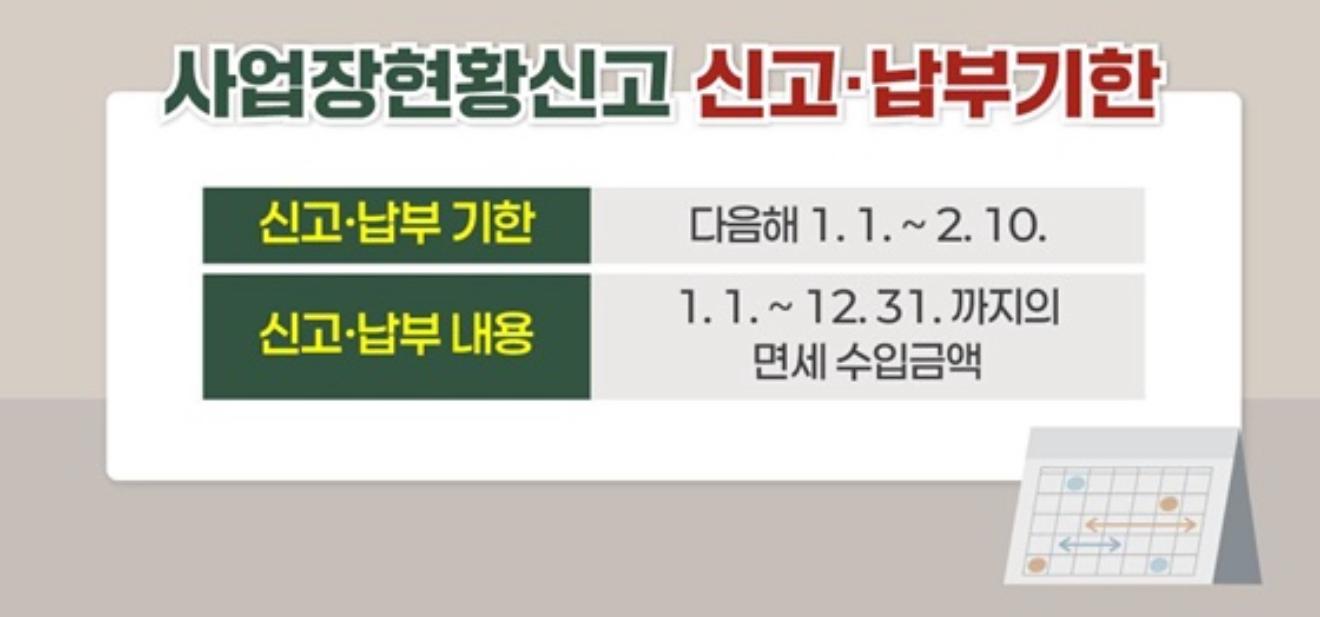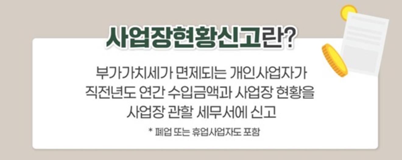 사업장현황신고란 부가가치세가 면제되는 개인사업자가 직전년도 연간 수입금액과 사업장 현황을 사업장 관할 세무서에 신고