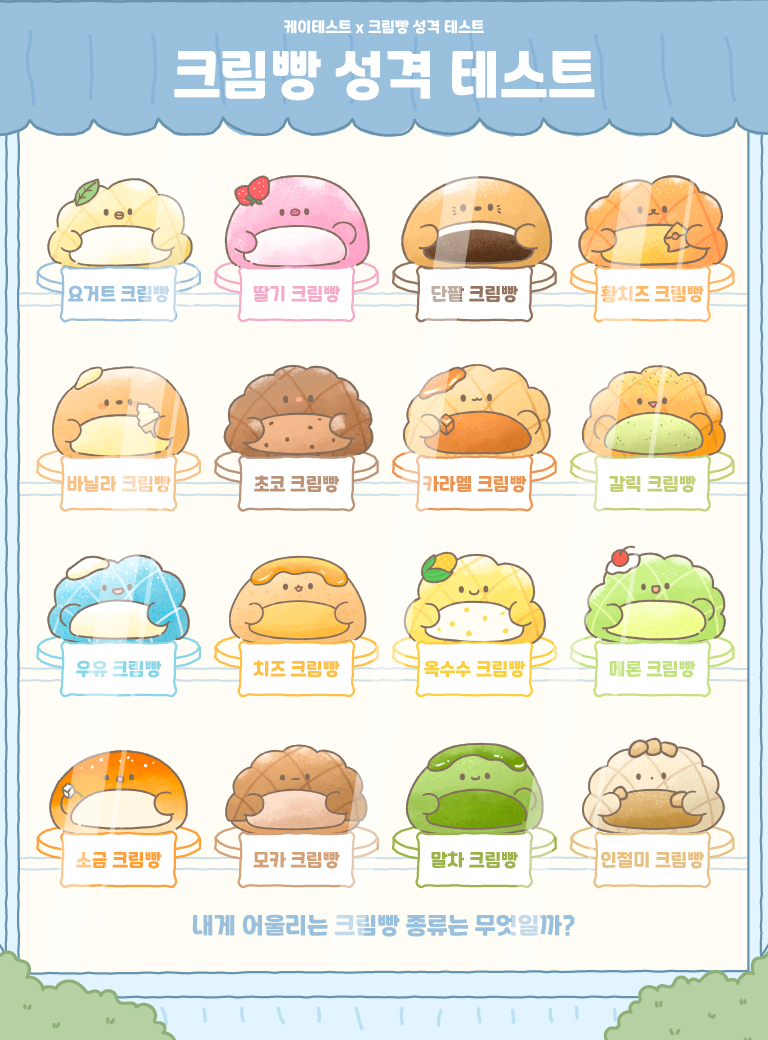 내게 어울리는 크림빵 종류는 무엇일지 알아보는 케이테스트에서 나온 ‘크림빵 성격 테스트’를 소개드리겠습니다.