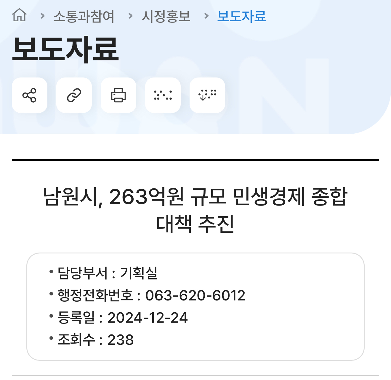 더불어 소상공인과 농업인 경영안전 지원, 기업 경쟁력 강화, 취약계층 생활안정 지원 등을 위해 33억원을 추가로 지원하는 등 총 263억원 규모의 민생경제 종합대책을 마련하였으며 2025년 1월 제1회 추경예산을 긴급 편성할 계획이라고 합니다.