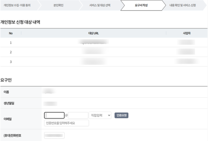 - 이메일 주소, 휴대전화번호 입력하여 요구서 작성