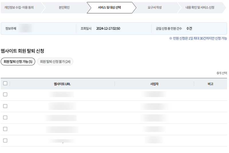 - 회원 탈퇴 신청이 가능한 웹사이트 중 탈퇴 신청할 웹사이트 선택