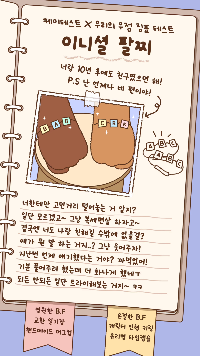 우리의 우정 징표는 어떤 물건일지 알아보는 케이테스트에서 나온 ‘우리의 우정 징표 테스트’를 소개드리겠습니다.
