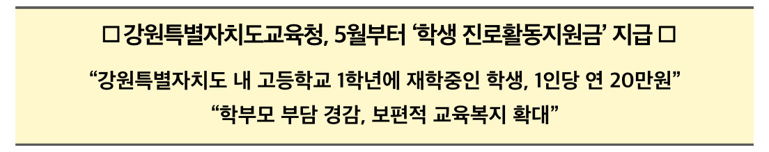 강원특별자치도교육청(교육감 신경호)은 2025년 5월부터 강원특별자치도 내 고등학교 1학년에 재학 중인 학생에게 ‘학생 진로활동지원금’을 지급한다고 합니다.