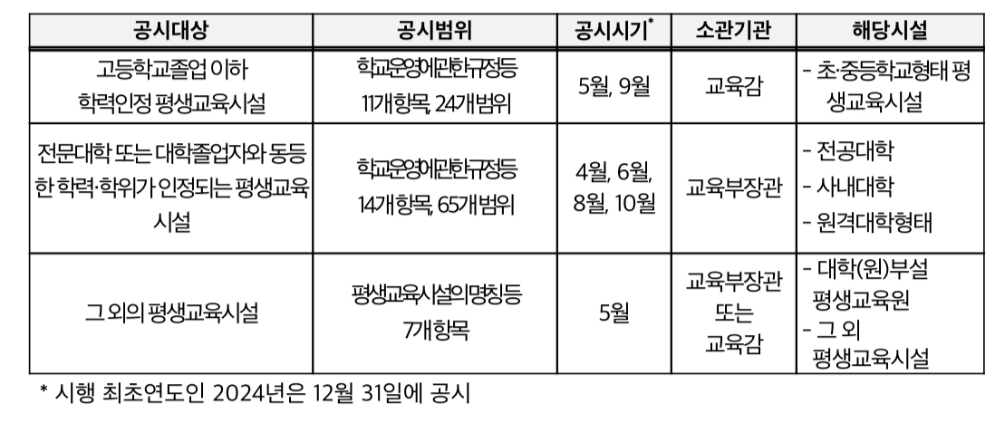 공시 범위와 시기는 ‘고등학교 이하 학력인정 평생교육시설, 전문대학 또는 대학졸업자와 동등한 학력·학위가 인정되는 평생교육시설, 그 외의 평생교육시설’ 등 공시 대상에 따라 구분된다고 합니다.
