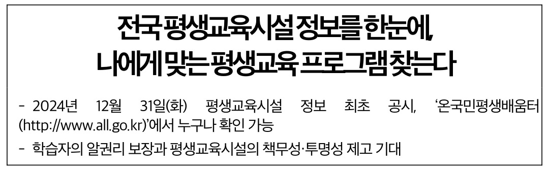 교육부(부총리 겸 교육부 장관 이주호)와 국가평생교육진흥원(원장 직무대행 심한식)은 2024년 12월 31일(화) 평생교육시설의 정보를 공시하였다고 합니다.