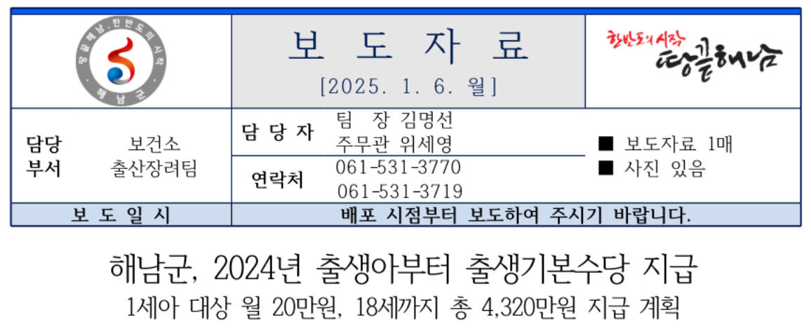한편 기존 해남군의 정책인 △신생아 양육비 △첫 만남 이용권 △기저귀 구입비 △부모급여 △가정양육수당 △아동수당 △교육수당 등 연령별 지원도 변함없이 실시된다고 합니다.