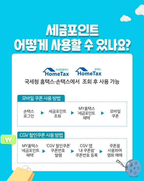 MY홈택스 '세금포인트 혜택' → 'CGV 할인쿠폰' 쿠폰번호 발행 → CGV 앱 '내 쿠폰함' 쿠폰번호 등록 → 쿠폰을 사용하여 영화 예매