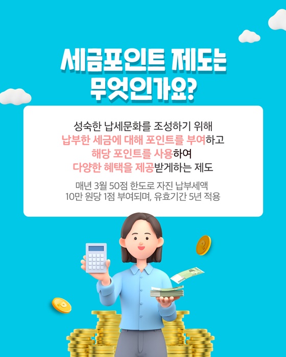 세금포인트 제도는 성숙한 납세문화를 조성하기 위해 납부한 세금에 대해 포인트를 부여하고 해당 포인트를 사용하여 다양한 혜택을 제공받게하는 제도입니다.