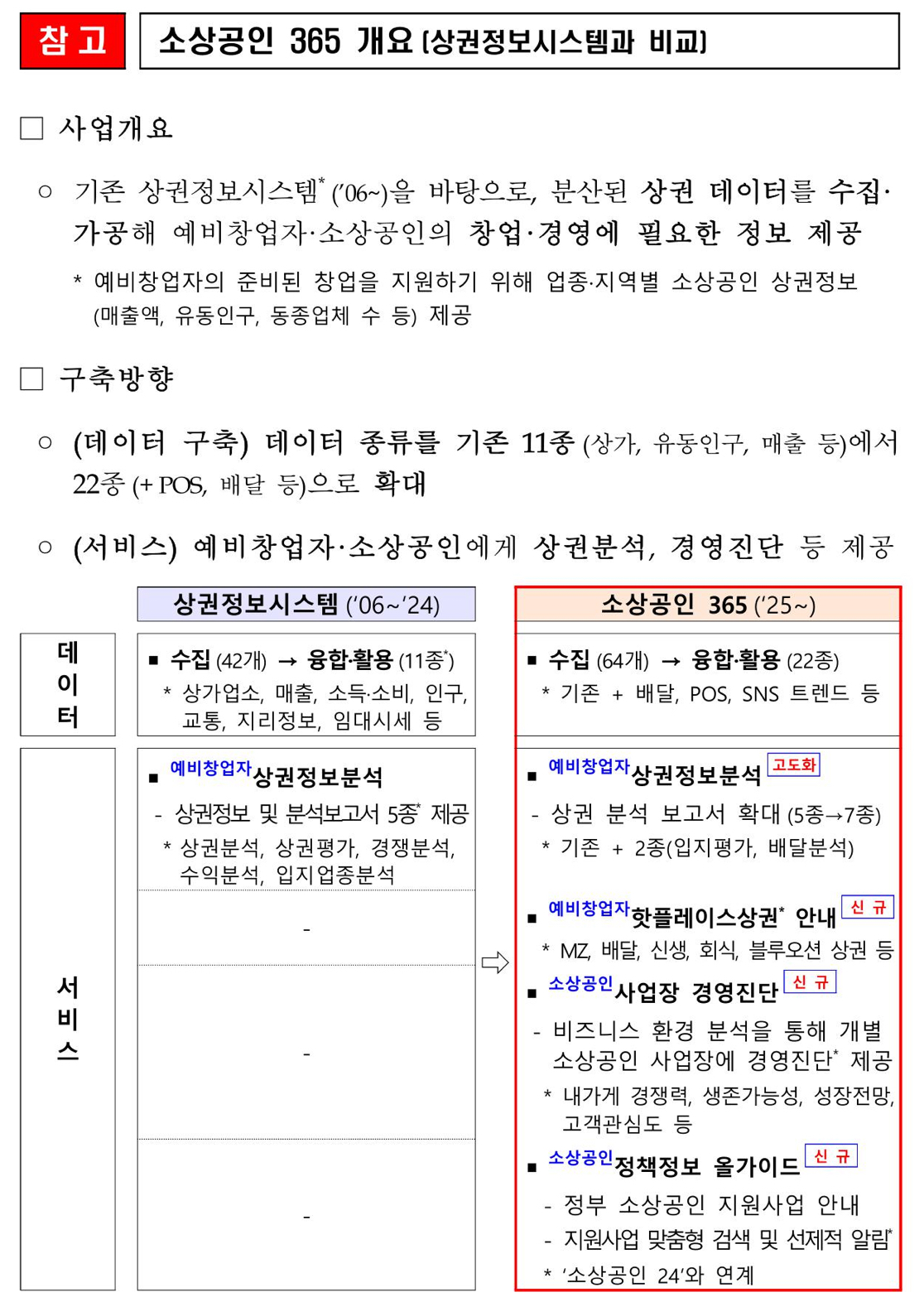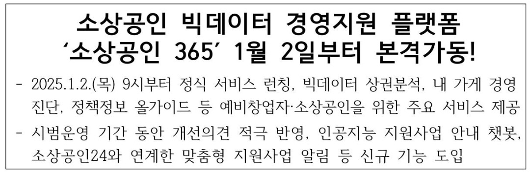 중소벤처기업부(장관 오영주, 이하 중기부)와 소상공인시장진흥공단(이사장 박성효, 이하 소진공)은 예비창업자 및 소상공인을 위한 데이터 기반 경영지원 플랫폼인 ‘소상공인 365(https://bigdata.sbiz.or.kr/)’의 시범운영을 마치고, 2025년 1월 2일(목) 9시부터 정식 서비스를 개시한다고 밝혔급니다.