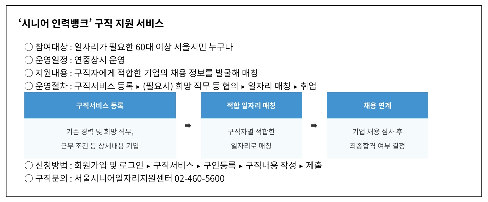 2025년 1월 13일부터는 ‘시니어 인력뱅크’ 등록 이벤트도 진행한다는데 60세 이상 구직을 희망하는 서울시민이라면 누구나 참여할 수 있으며 센터 누리집(https://50plus.or.kr/sjc)에서 구직 관련 정보를 등록한 신청자 중 선착순 500명에게는 기념품도 제공한다고 합니다.