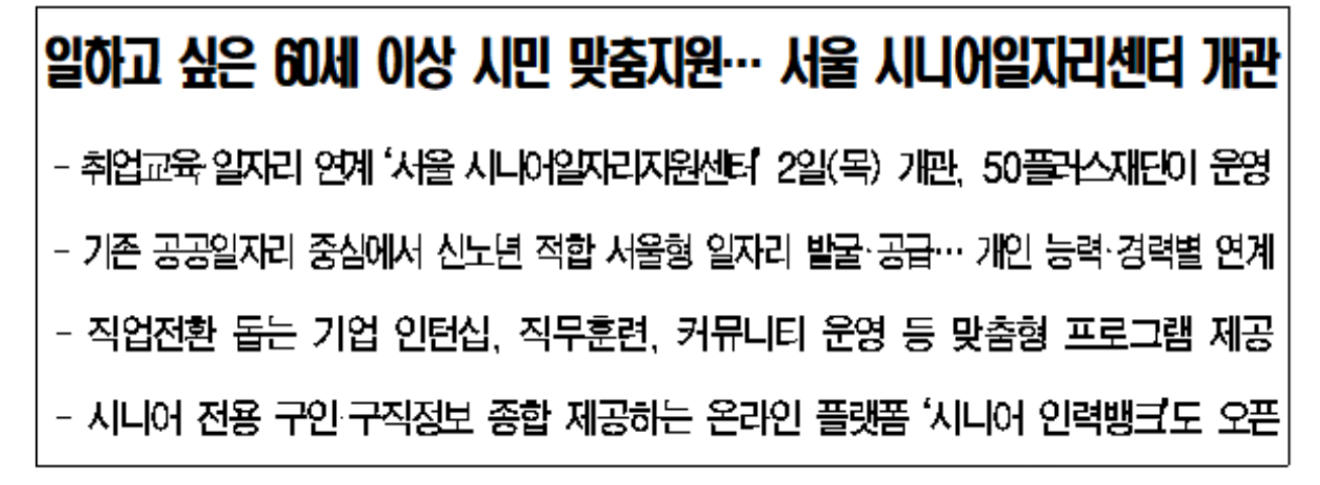 서울시가 매년 늘고 있는 일할 의지와 역량이 있는 60세 이상 서울시민의 취업을 본격적으로 지원하기 위해 서울시니어일자리지원센터를 2025년 1월 2일 개관했다고 합니다.