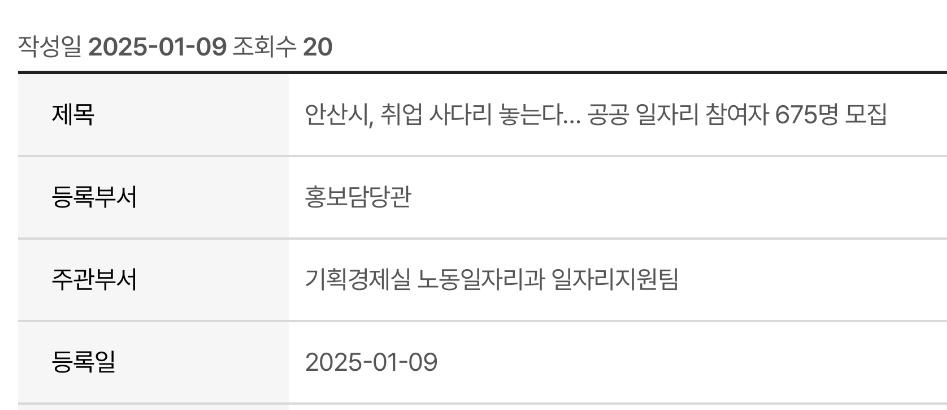 안산시(시장 이민근)는 2025년 상반기 공공 일자리 사업 참여자를 오는 2025년 1월 13일부터 17일까지 모집한다고 밝혔습니다.