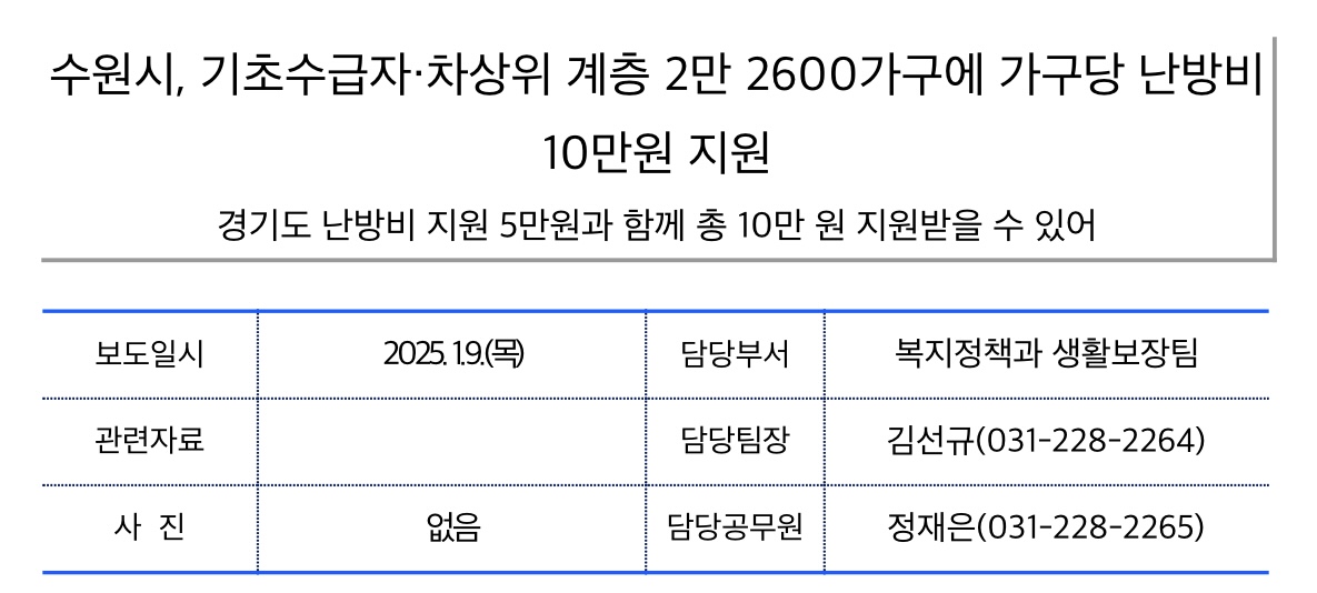 수원시 기초수급자 차상위계층 취약계층 난방비 지원 대상은 2025년 1월 3일 기준 수원시에 주민등록이 돼 있는 기초생활수급자(생계·의료·주거·교육), 차상위계층(한부모가족·차상위본인부담경감·차상위장애인·차상위자활·차상위계층확인) 2만 2600가구라고 합니다.