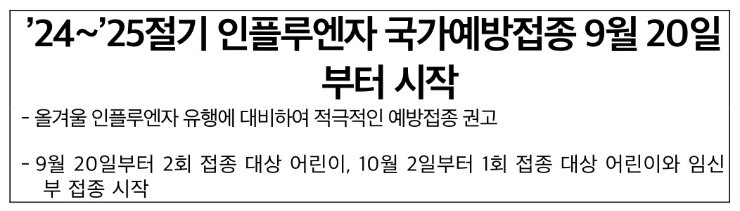 질병관리청(청장 지영미)은 2024년 9월 20일(금)부터 내년 2025년 4월 30일(수)까지 2024-2025절기 인플루엔자 국가예방접종을 시작한다고 밝혔습니다.