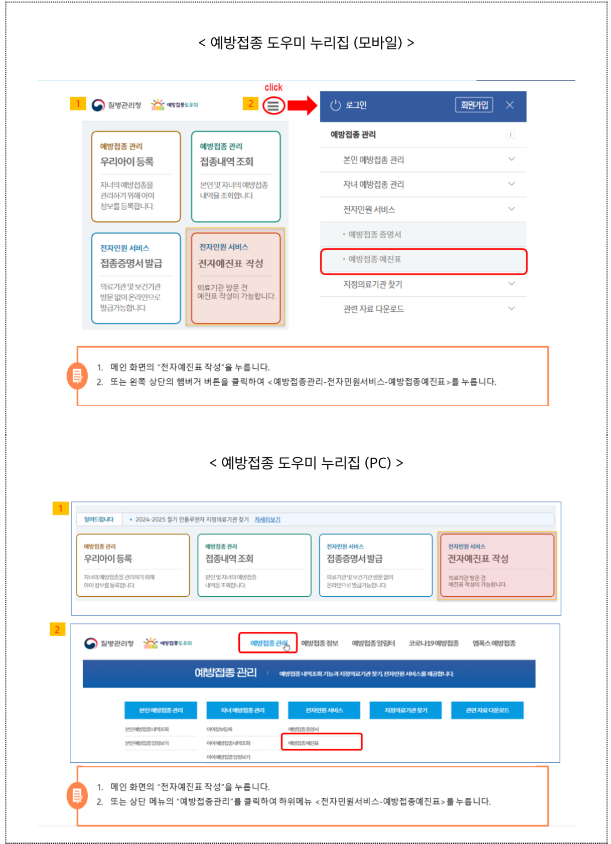 이번 절기부터는 접종자의 편의를 제고하기 위해 사전에 집에서도 편하게 예진표를 작성할 수 있도록 전자예진표가 도입되어 활용될 예정이라고 합니다.