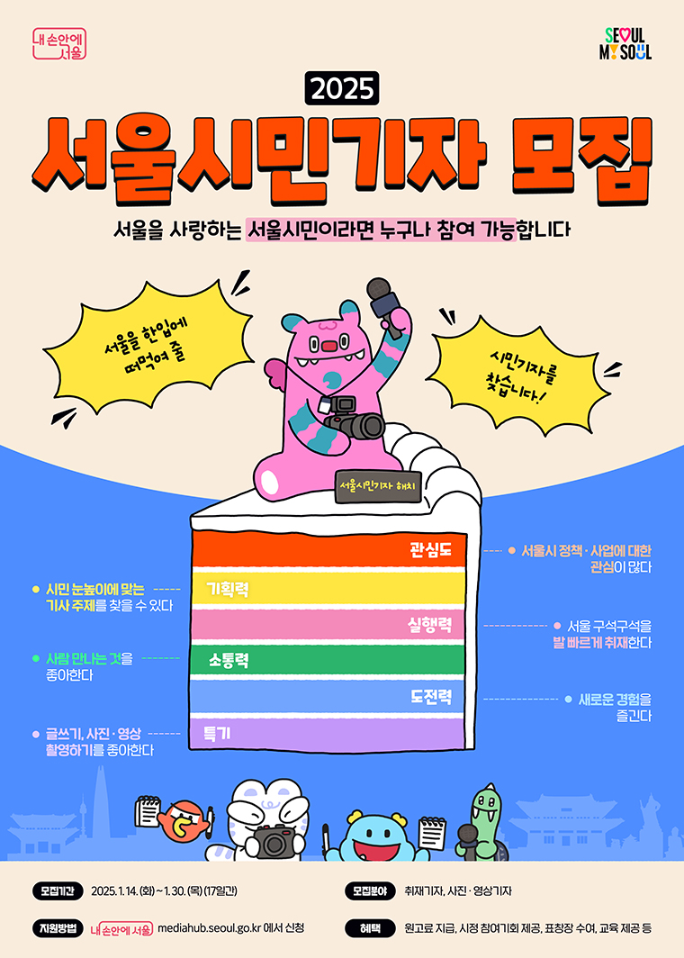서울시의 대표 시민기자단 ‘서울시민기자’가 2025년 모집을 시작한다. 서울시민기자는 서울시의 정책·시설·행사 등 서울생활에 꼭 필요한 정보를 시민이 직접 체험하고 취재해서 서울시 온라인 뉴스룸 내 손안에 서울에 기사를 전하고 있습니다.