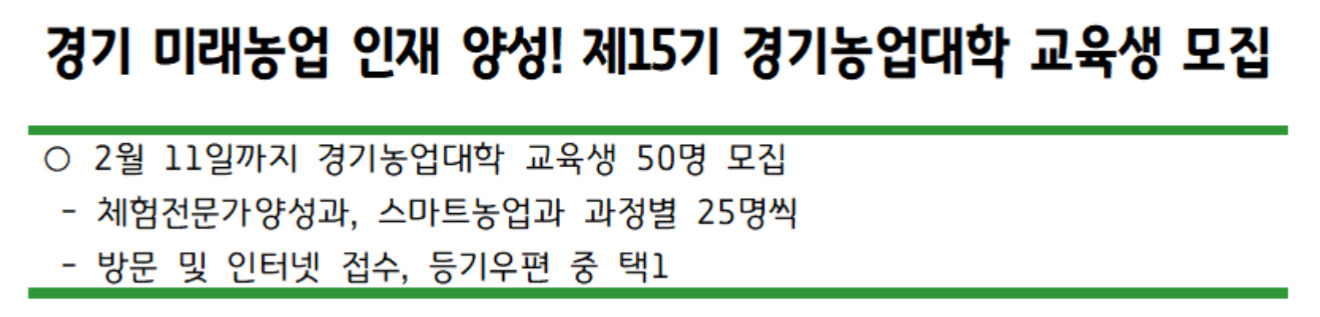 경기도농업기술원이 2025년 2월 11일까지 2025년 제15기 경기농업대학의 교육생 50명을 모집한다고 합니다.