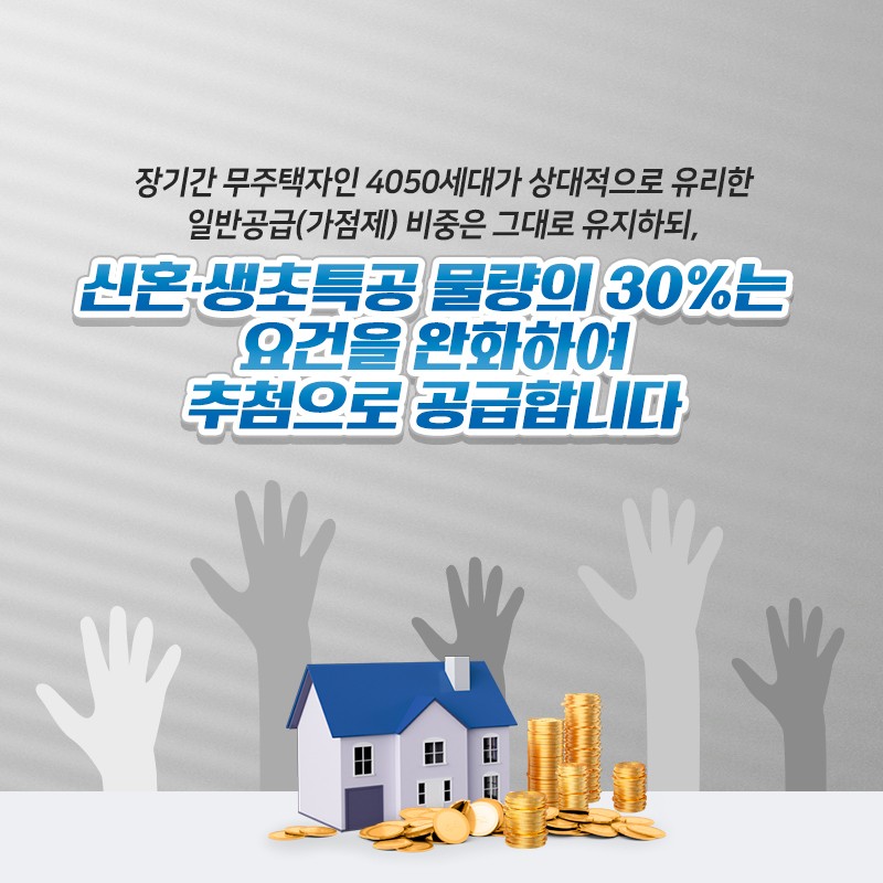 일반공급(가점제) 비중은 그대로 유지하되, 신혼·생초특공 물량의 30%는 요건을 완화하여 추첨으로 공급합니다